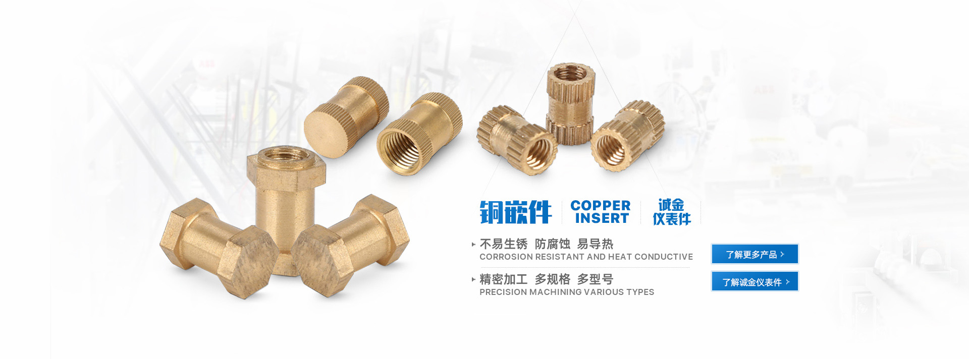 樂清市誠金儀表件有限公司是一家以研制、生產、銷售電力儀表為主的現代化企業。公司坐落于浙江樂清柳市鎮華東工業區。公司專業生產銅嵌件、接線柱、接線端子、零電排、導電帶等銅產品。公司只做有品質的銅嵌件。獲得海內外同行的一致認可。